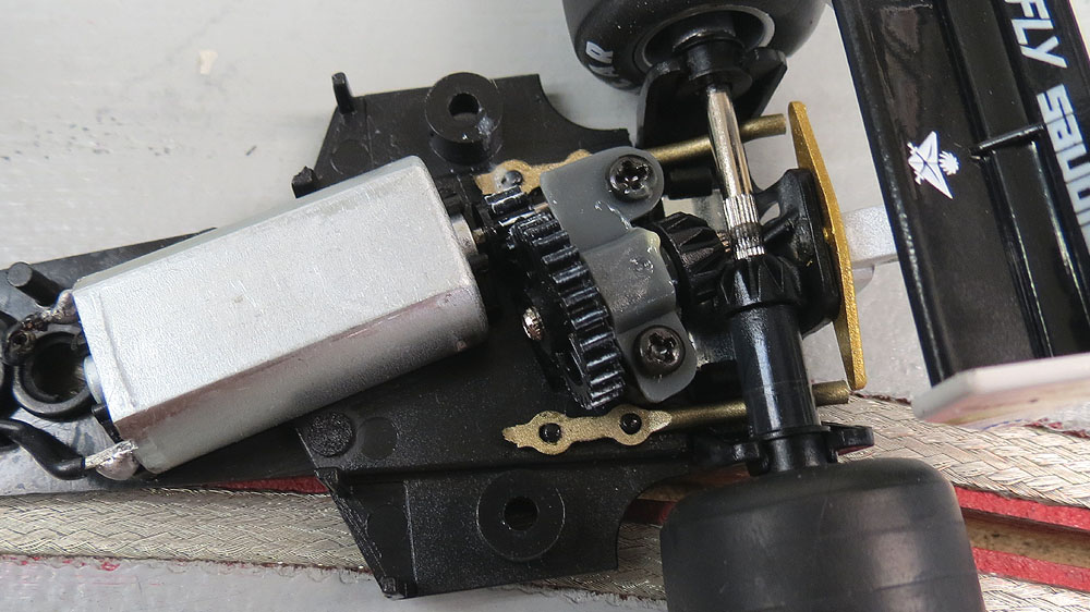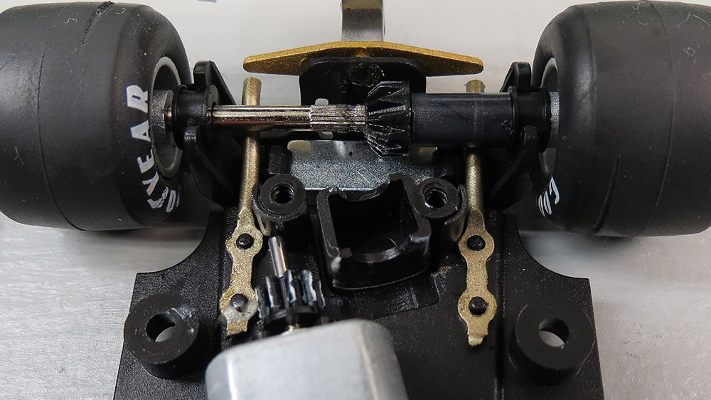 The reason for it? So that there is no "hump" visible in the rear of the car to allow clearance of standard inline gearing. So the thinking is to use this type of drive-train to help increase scale accuracy, yet items like the intake, wheels and poor paint work are acceptable.