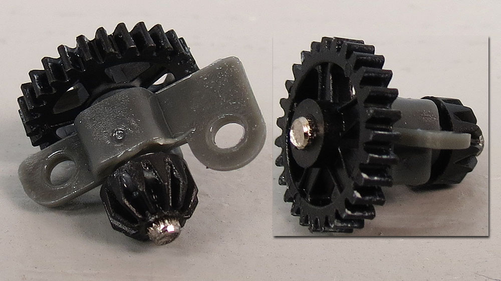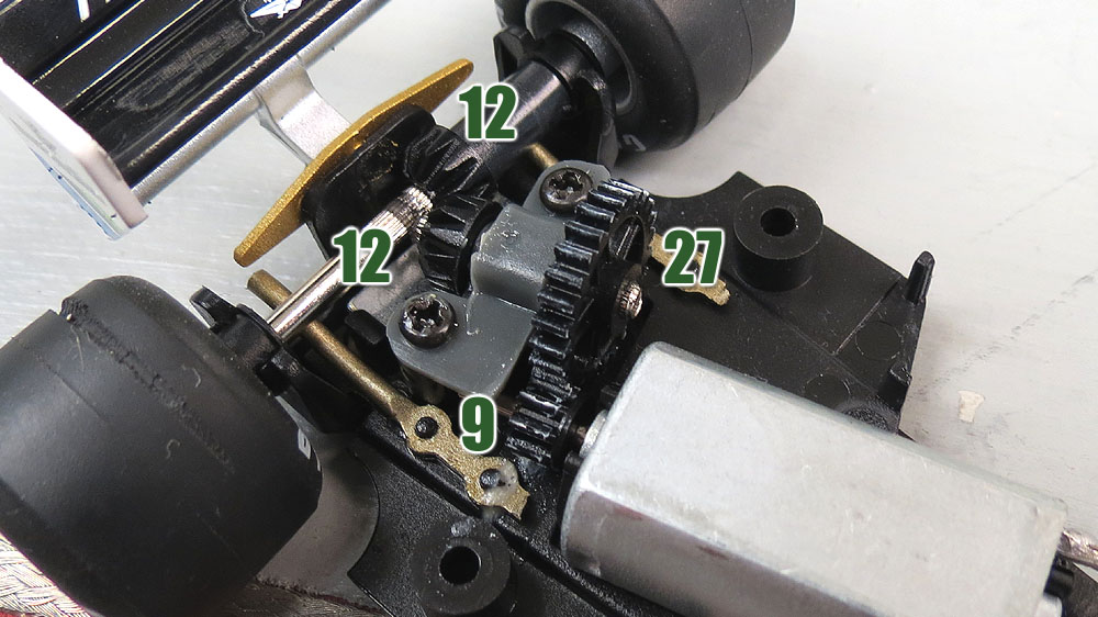 There are 4 gears total. 9 tooth pinion, 27 Spur, and 2 12 tooth bevel/miter gears. The gears did not have a lot of slop than I expected, but this is going to vary from car to car I am certain.